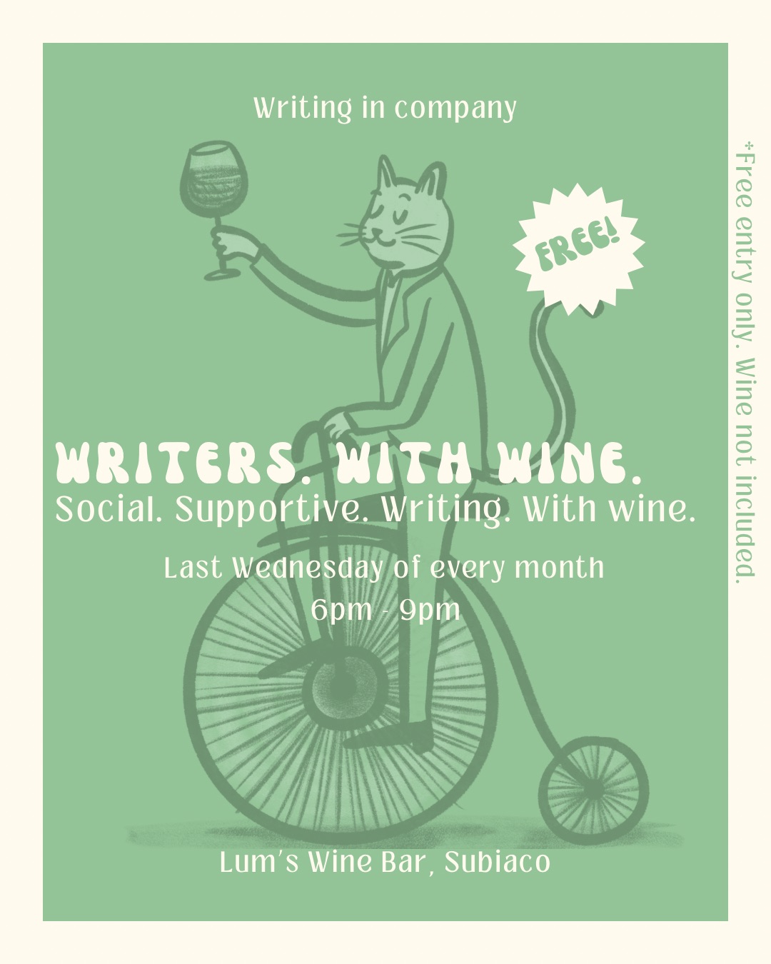 Writers With Wine is a welcoming space for aspirational, emerging and established writers. It is not a class, workshop, or a lecture, nor a guarantee of feedback or editing by other attendees.