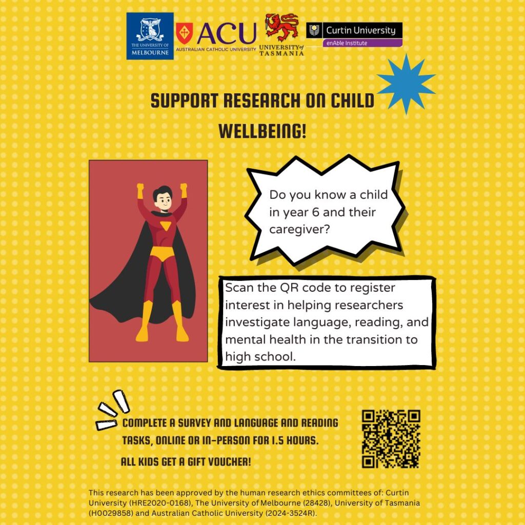 The move from primary to high school can be a stressful period for children. This move happens during early adolescence, a time of increased risk for the development of mental health problems. This transition might be particularly stressful for children with language and/or literacy difficulties, due the increased educational and literacy related demands placed on children. If you have a child in year 6 you and your child can participate in this study to help us understand how to support kids during the transition to high school.